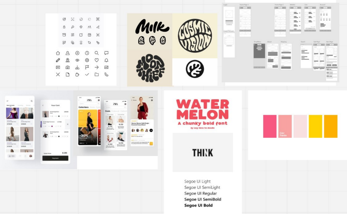 In this board, I included various logo inspirations, app design inspiration, icons, fonts, colour palette, and my wireframes.